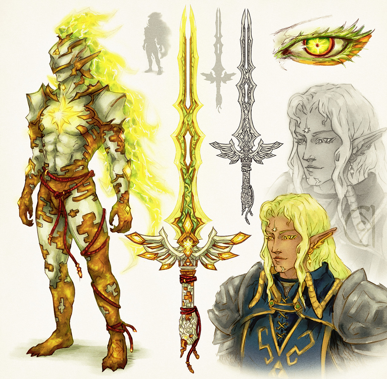 Lucius has described the main materials used in his construction as such: ivory, gold, topaz, stardust, star fragments and last - but most certainly not least! - a large shard of Farosh's horn. The very latter of this list is what the blade itself is largely composed of, the pointed and curving ridges of its double-edges split down its head like the Thunderblades of old. The occasionally interrupted spine is covered with emerald scales and sporadically framed with sharp gold filigree. A spine down which is engraved - in antiquated Hylian script - the tenets of, 'Courage. Commitment. Chivalry.' (...Actually, I think I saw some of those characters on his back before too...? When he was in his more Hylian-facing forms.) A similar golden ornamentation accents the Hylia-crested wings of the guard, framing trios of diamond-chiseled topazes before forming a ring of triforce motifs above the grip. It then cascades in broken mosaic down towards a delicately sculpted depiction of Farosh themselves for the pommel - golden-horned, golden-fanged, and eyes ablaze with literal light. Sculpted ivory appears to make up the vast majority of this hilt, with a luxurious braid of noble-red framing both the top and the bottom of the grip, punctuated with golden beads.